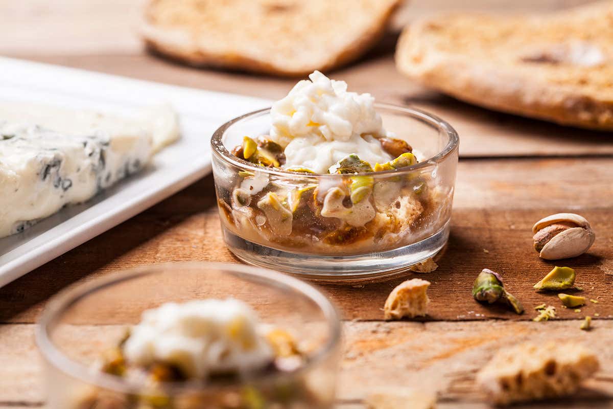 Gorgo delizia, mousse al Gorgonzola, biscotto e pistacchi