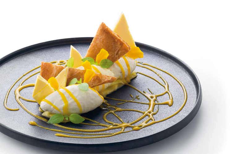 ASSEMBLAGGIOAffettare un po' di mango usando una mandolina giapponese e disporre le fette sul piatto a formare un rettangolo. Disporre due quenelle di crema alla banana alle estremità del mango e una quenelle di mango al centro. Guarnire con due triangoli di pasta sfoglia, meringa al mango, lime cress, fiori di calendula e la salsa al frutto della passione.