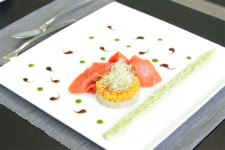 Salmone selvaggio Sockeye affumicato Foodlab con tortino di quinoa e zucca candita, accompagnato da un guacamole semplificato di avocado