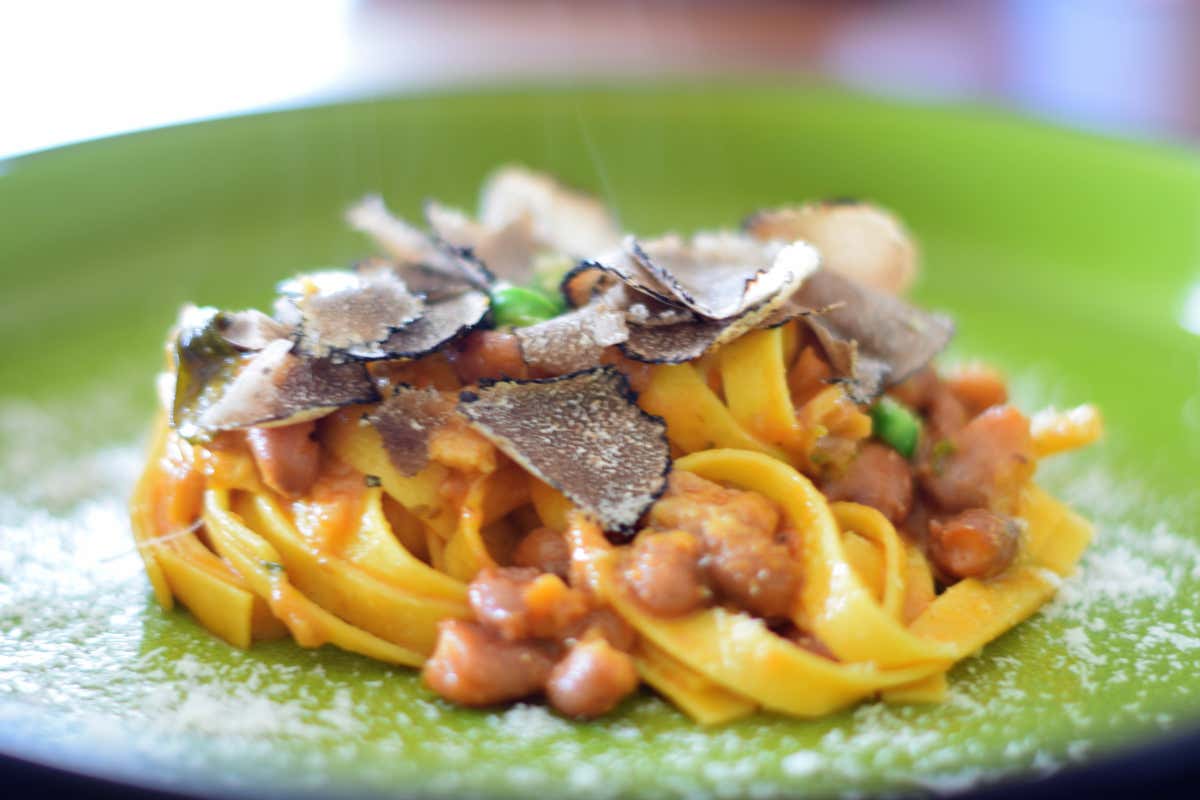 Tritare gli elementi aromatici con il bacon e la pancetta. Far dorare in casseruola con olio una foglia d’alloro e peperoncino. Aggiungere i pelati passati e aggiustare di sapore. Allungare con brodo vegetale. Far cuocere alcuni minuti e aggiungere i fagioli già precotti. Far cuocere per circa trenta minuti aggiungendo il timo e brodo se necessario. Cuocere le tagliatelle in abbondante acqua salata. Scolarle al dente e saltarle in padella con la salsa finchè non risulteranno cremose. Impiattare lamellando il tartufo e abbondante Grana Padano dei Prati Stabili.