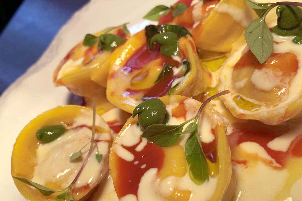 Tortellone di ragù napoletano, pesto di basilico e limone IngredientiPer la pasta:675 g di semola