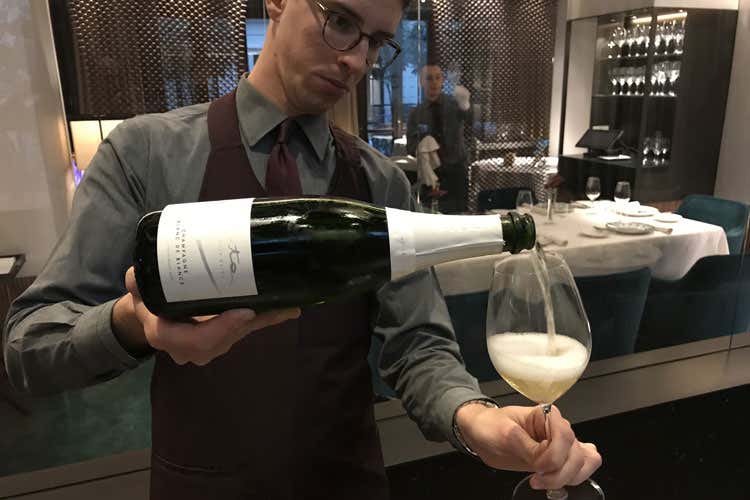 Uno Champagne gastronomico, un vino trasversale, elegante strumento di comunicazione dal prezzo più che abbordabile (90 euro la bottiglia, 22 il calice), soprattutto in rapporto al luogo dove viene servito in esclusiva.