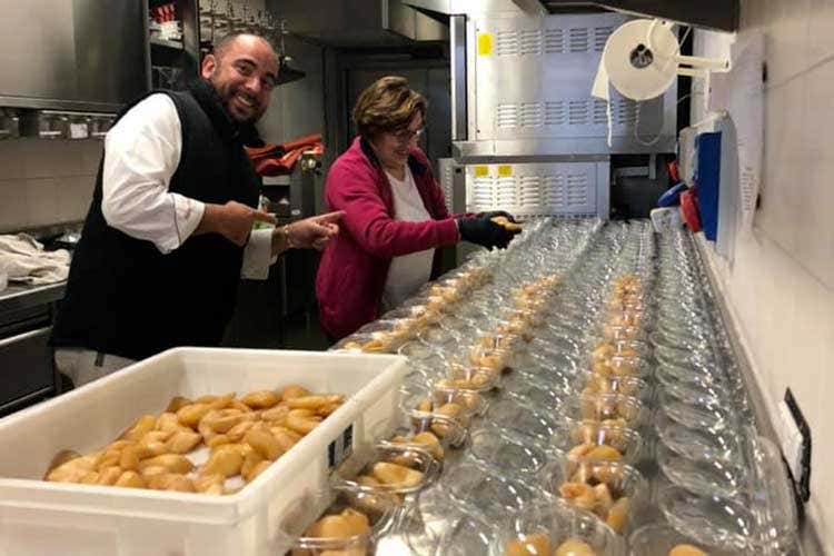 ho fatto le zeppole. Così ho portato un po’ dei sapori della mia terra. Ogni giorno cerchiamo di preparare una cosa diversa e soprattutto nutriente ma leggera perché possano lavorare con energia e serenità (le zeppole erano un’eccezione, ndr). Cerchiamo sempre di dare un pasto completo anche con del pane, un dolce, se si riesce. Le materie prime non mancano. Ce n’è da sfamare un esercito. E poi sono tutte donazioni; questo cibo per me ha un grande valore. È un onore per me. Oltre che un modo per tener la testa occupata».