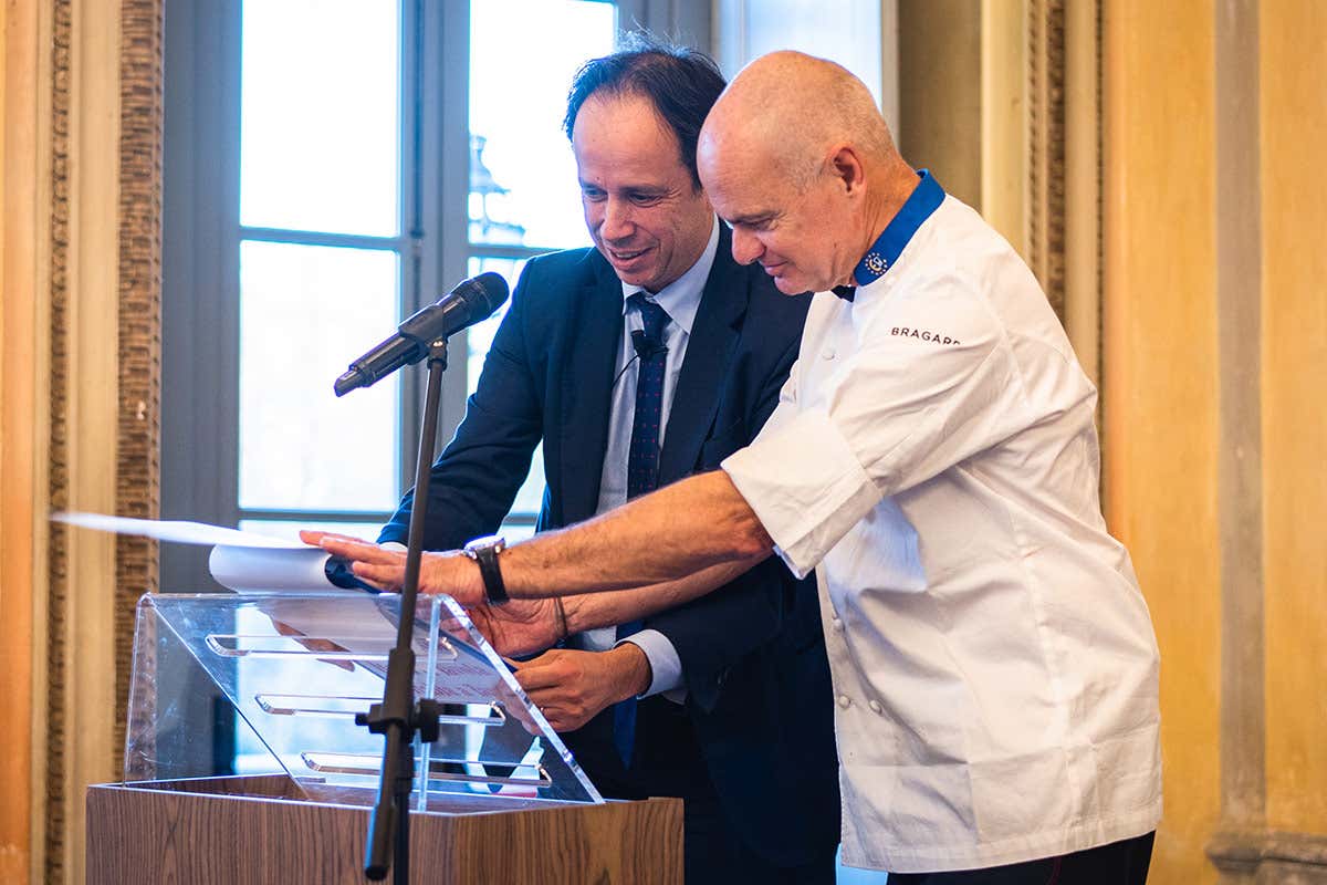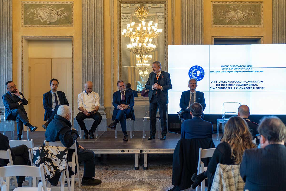 Alla Villa Reale di Monza sono intervenuti, moderati da Alberto Lupini, direttore di Italia a Tavola, il ministro del Turismo Massimo Garavaglia, il presidente di Enit Giorgio Palmucci, il direttore generale di Fipe Roberto Calugi, il presidente di Asacert Fabrizio Capaccioli ed Enrico Derflingher, riconfermato alla presidenza di Euro-Toques in un consiglio rinnovato formato da Filippo Sinisgalli (vicepresidente), Paolo Gramaglia (segretario generale), Giovanni Porretto e Antonino Fratello. All’incontro ha presenziato anche Umberto Bombana, nove stelle Michelin in Oriente, in qualità di ospite, mentre l’assessore Fabrizio Sala ha portato i saluti di Regione Lombardia.