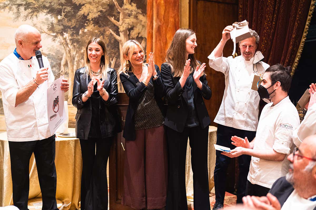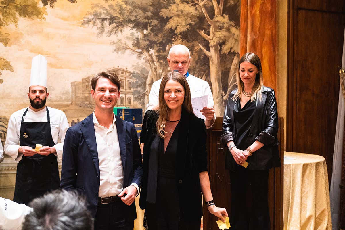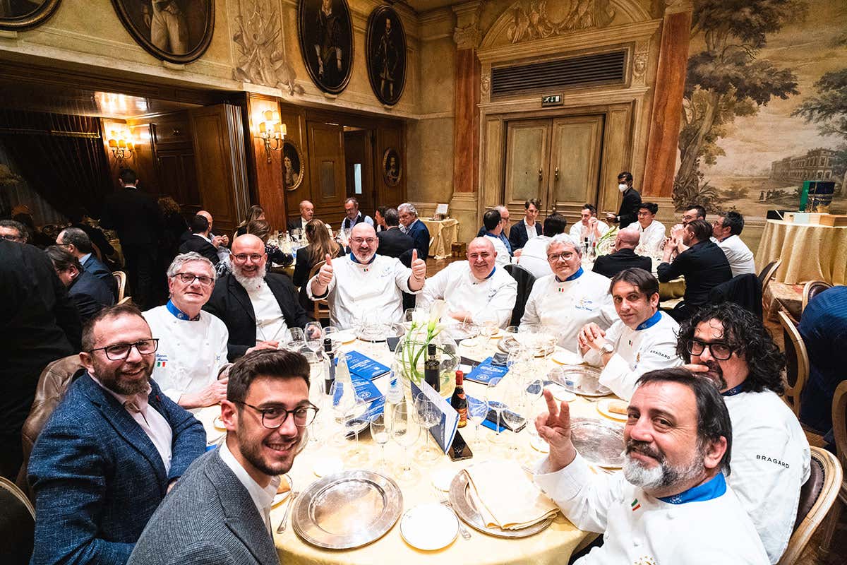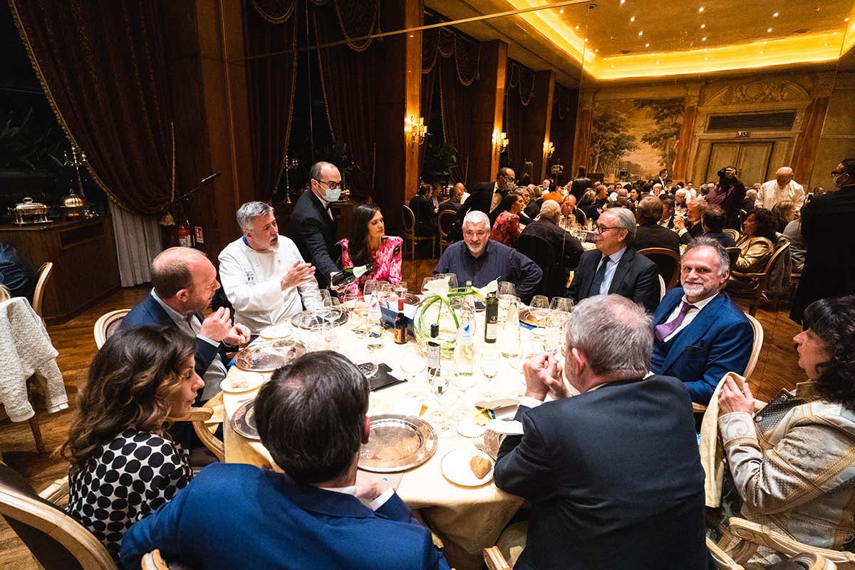 Come antipasto è stata servita la “Trota alla coque, le sue uova crema di Spressa e cipolla di Cannara” di Filippo Sinisgalli (Ristorante KaiserKron di Bolzano), accompagnata da Bellavista Grande Cuvée Alma Brut. Come primo piatto il “Riso Carnaroli Campo dell’Oste con gambero reale e capperi di Lipari” preparato da Paolo Rota (Ristorante Da Vittorio di Brusaporto, Bergamo, 3 stelle Michelin) e accompagnato da Cuvée Blanc de Blancs 72 mesi Champagne Jh Quenardel. Per secondo, “Fracosta di Scottona Charolaise Cascina Leva con rosmarino di Montevecchia, limone amalfitano e patate al peperone crusco”, realizzata da Enrico Derflingher e Fabio Silva (Ristorante Derby Grill - Hotel de la Ville di Monza) e servita con Grumarello 2016 Docg Carmignano Riserva Artimino. Come dessert, “Sasso al Braulio con terra al saraceno, meringa alle betulle, gel ai mirtilli e gelato al fior di latte Fiorida” preparato da Gianni Tarabini (Ristorante La Présef - Agriturismo La Fiorida a Mantello, Sondrio, 1 stella Michelin) e “Cannoli siciliani” di Peppe Triolo, in abbinamento al Moscato d’Asti Docg 2021 Bava.