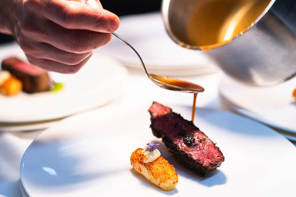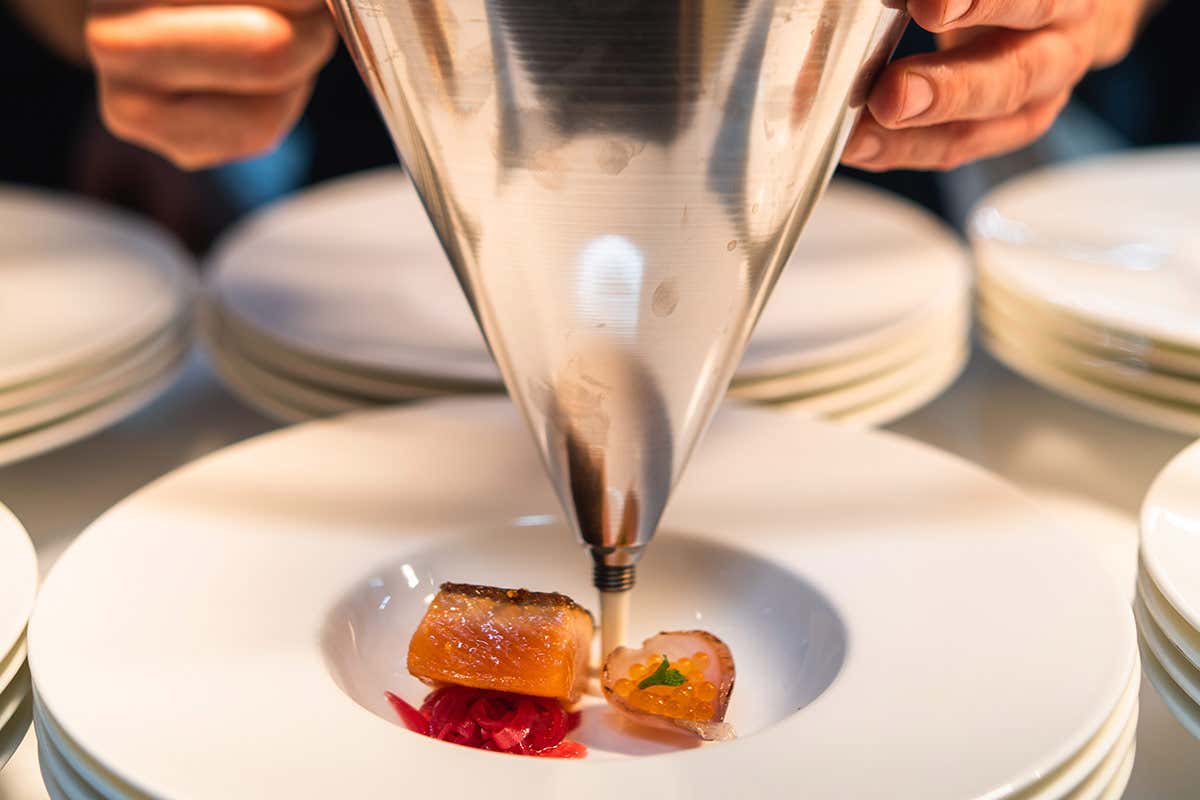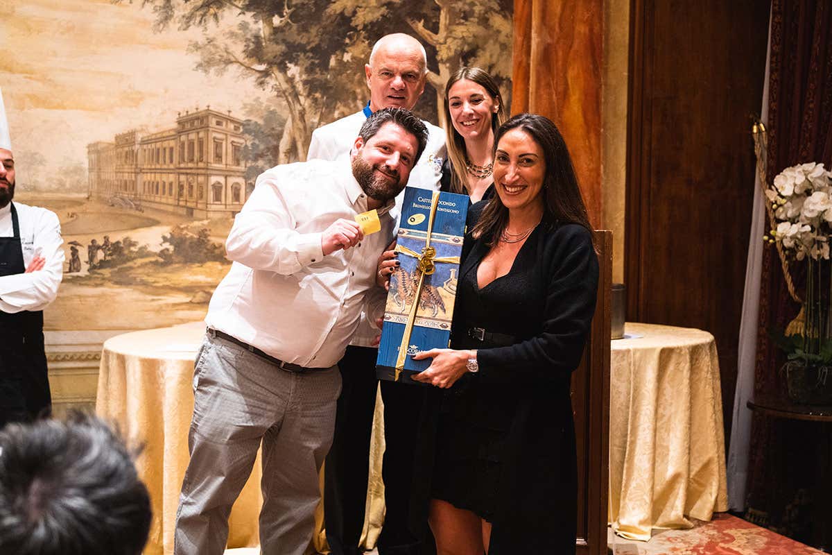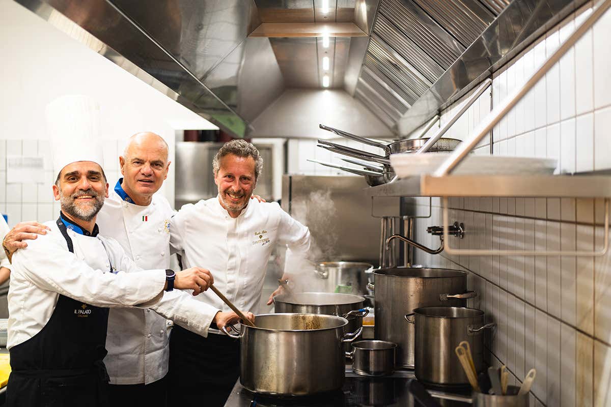 Come antipasto è stata servita la “Trota alla coque, le sue uova crema di Spressa e cipolla di Cannara” di Filippo Sinisgalli (Ristorante KaiserKron di Bolzano), accompagnata da Bellavista Grande Cuvée Alma Brut. Come primo piatto il “Riso Carnaroli Campo dell’Oste con gambero reale e capperi di Lipari” preparato da Paolo Rota (Ristorante Da Vittorio di Brusaporto, Bergamo, 3 stelle Michelin) e accompagnato da Cuvée Blanc de Blancs 72 mesi Champagne Jh Quenardel. Per secondo, “Fracosta di Scottona Charolaise Cascina Leva con rosmarino di Montevecchia, limone amalfitano e patate al peperone crusco”, realizzata da Enrico Derflingher e Fabio Silva (Ristorante Derby Grill - Hotel de la Ville di Monza) e servita con Grumarello 2016 Docg Carmignano Riserva Artimino. Come dessert, “Sasso al Braulio con terra al saraceno, meringa alle betulle, gel ai mirtilli e gelato al fior di latte Fiorida” preparato da Gianni Tarabini (Ristorante La Présef - Agriturismo La Fiorida a Mantello, Sondrio, 1 stella Michelin) e “Cannoli siciliani” di Peppe Triolo, in abbinamento al Moscato d’Asti Docg 2021 Bava.