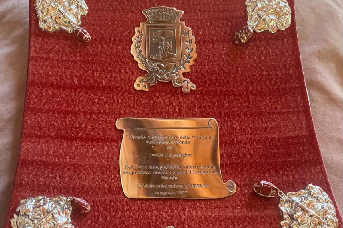 L’ex chef di Casa Reale e della Casa Bianca ha accolto l’invito del sindaco della cittadina sulla costa degli Dei, Enzo Marasco e del vicesindaco nonché direttore artistico dell’evento Franco Barbalace, per ricevere il riconoscimento di “Ambasciatore della ‘Nduja di Spilinga nel Mondo”, premio realizzato dal maestro orafo calabrese Gerardo Sacco e consistente in un piatto in ceramica di colore rosso con fregi in argento, cesellato a mano. «Il rosso del piatto – si legge nel retro del premio – ricorda il colore della ‘Nduja mentre sui quattro angoli maschere apotropaiche con pendenti a forma del celeberrimo salume […] propiziatorie di fortuna, salute e felicità».