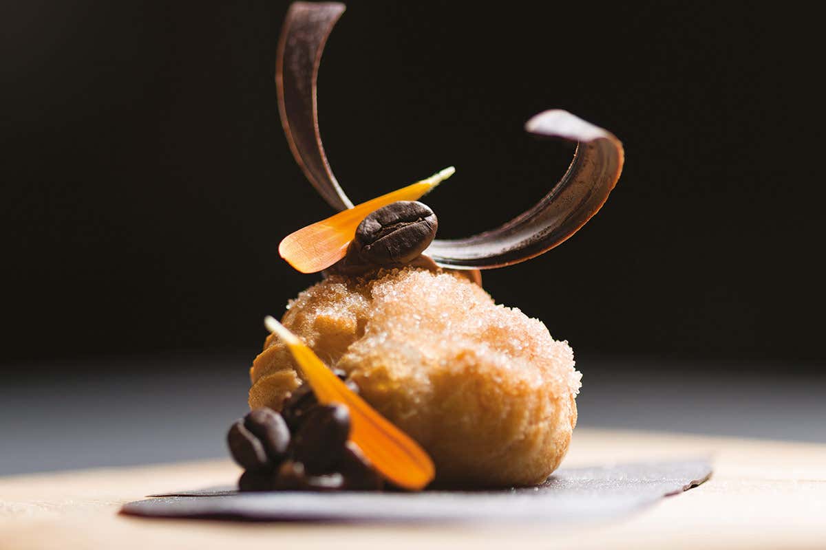 Composizione del piatto: dopo aver riempito i bignè con il cremoso al mascarpone. guarnire con decorazioni in cioccolato e chicchi di caffè tostati.