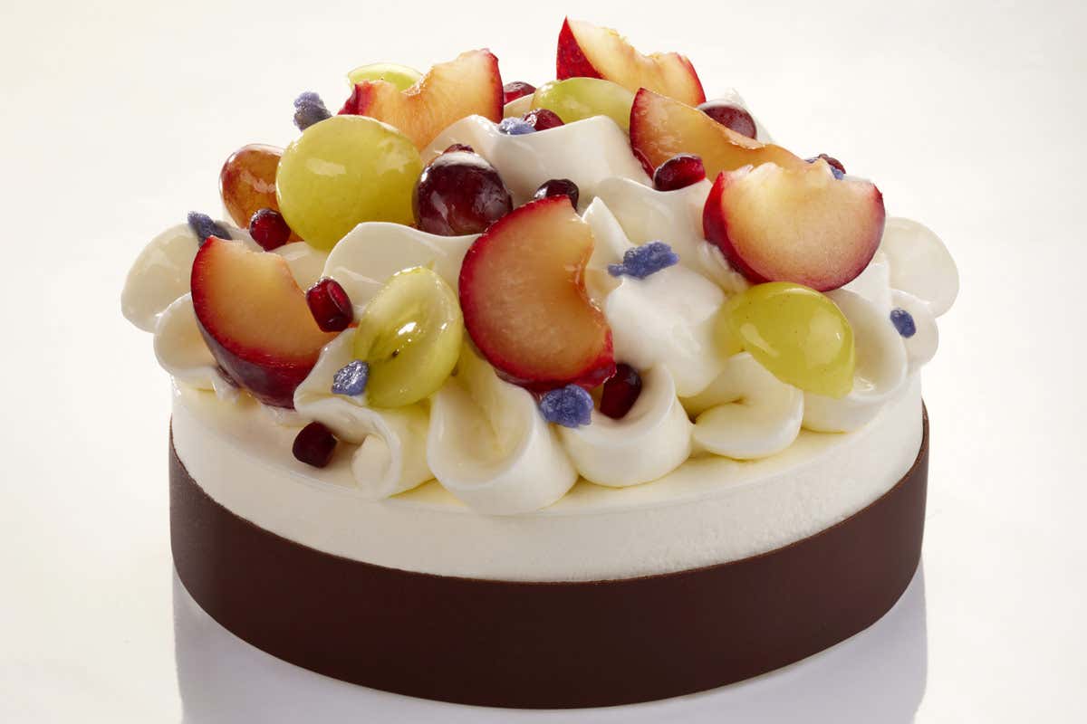 Inserire in un anello da 18 cm la base croccante. Dressare la mousse al Soft Style Cream Cheese fino a metà dell’anello. Quindi posizionare al centro il gelée e colmare con altra mousse. Decorare con una bocchetta Saint-Honorè, poi abbattere a temperatura negativa. Successivamente sformare, spruzzare con gelatina neutra e decorare con frutta di stagione (uva, susine, melograno), petali di violetta cristallizzata e decorazioni in cioccolato al latte.