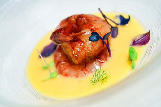 Entrèe di Rossi di Mazara, beurre blanc al sakè e gamberone rosso - Food Design