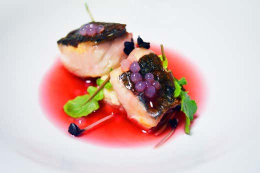 Tataki di ricciola marinata in salamoia di zenzero rosso, brodetto tiepido di aceto di mele al ribes e lampone, mousse di melanzana viola montata con latte affumicato, caviale di ravanello al tè Lapsang Souchong