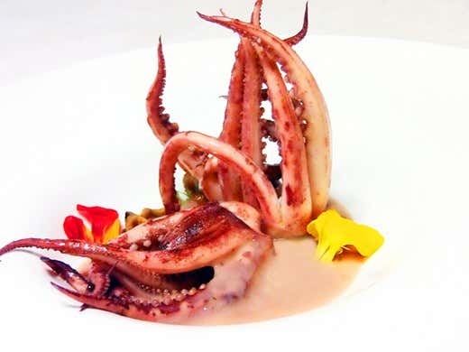 Preparazione: Pulire i calamari separando quelli che nel gergo popolare vengono chiamati ciuffi, ovvero la parte con i tentacoli, dal resto del corpo. Consigliamo sempre di comprare i calamari interi e freschi, l’operazione per ottenere i ciuffi è molto semplice. Si afferra il ciuffo di tentacoli e si tira: la testa verrà via con gran parte delle viscere attaccate. All’interno della sacca possono rimanere residui e a volte le uova (un insieme gelatinoso): levate tutto infilando un dito e togliendo anche la pinna trasparente, che nel totano per esempio è più sottile e aderente alla sacca. Lavare accuratamente i ciuffetti. Metterli ad asciugare su un telo di lino, delicatamente. Marinare per 2 ore circa i ciuffetti con spicchi di limone verde, succo di limone bio fresco, sale doppio, pepe bianco. Riporre i ciuffetti nel frigo in un contenitore di vetro con chiusura ermetica. Lavare le patate viola. Cuocerle partendo da una base di acqua fredda per almeno 20 minuti. Far reidratare i porcini secchi in acqua tiepida e tenerli da parte. Passare le patate viola allo schiaccia-patate. Ricavarne la polpa, e passarla al thermomix con due mestoli di brodo vegetale fresco fino a ottenere una vellutata perfetta. Grigliare i ciuffetti al wok con la loro marinatura. Passare i funghi porcini in padella, saltandoli un istante con un trito di prezzemolo e erba cipollina. Aggiustare di sale e di pepe, sfumare con il brodo vegetale.