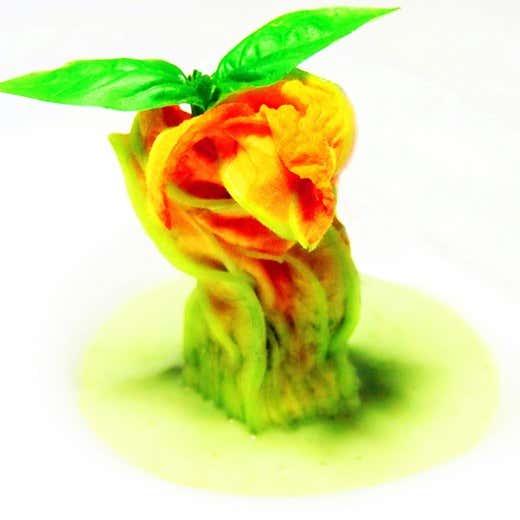 Amuse-bouche di fiore di zucca al vapore, ricciola, su crema di basilico - Food Design