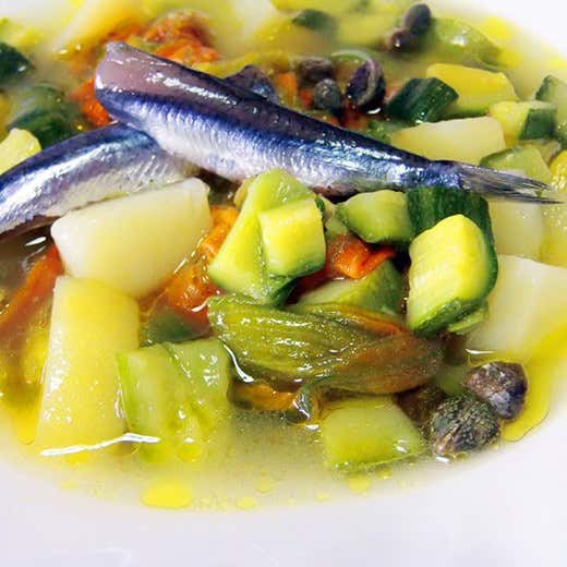 Preparazione. Pulire i fiori di zucca, eliminando il pistillo e il polline. Lavare delicatamente i fiori per eliminare le impurità, metterli ad asciugare su un telo di lino, tagliarli a tocchetti grossi. Affettare le patate dopo averle sbucciate, realizzando dei tocchetti non molto piccoli. Scaldare l'acqua da parte senza salarla. Affettare le zucchine a dadini mettendo in risalto la parte verde. Schiacciare due spicchi di aglio ed eliminare la buccia. Pulire le alici, eliminando la testa e tirando via la spina centrale tagliandola all'ultimo stadio con una forbicina per lasciare la coda. Riporre le alici a sanificare in abbattitore e farle scongelare a temperatura ambiente. Far sudare l'aglio con due cucchiai di olio, qualche gambo di prezzemolo, peperoncino fresco. Eliminare l'aglio e il prezzemolo e aggiungere le patate. Farle rosolare, a fiamma moderata, aggiungere le zucchine e poi l'acqua calda e far stufare. Aggiustare di sale e di pepe e solo alla fine aggiungere i fiori di zucca che devono rosolare a fiamma spenta. Composizione del piatto: disporre la zuppetta in un piatto fondo, aggiungere le alici fresche che precedentemente avremo messo a marinare per 50 minuti sotto sale doppio che poi elimineremo. Lasciare le alici a mollo nel brodetto per un paio di minuti prima di servire. Unire i capperi dissalati che avremo reso croccanti in forno a 200 gradi per 20 minuti abbondanti. Profumare il piatto con prezzemolo fresco.