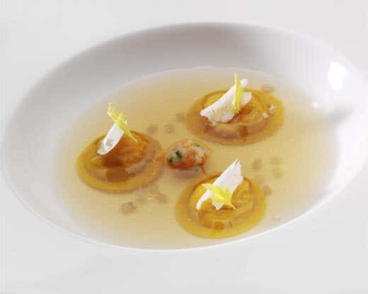 Per il consommé: 750 g polpa di coscia di cappone di Morozzo tritata, 1 collo di cappone di Morozzo, 100 g carote tritate, 100 g porro tritato (usare solo il cuore più bianco) , 1/2 costa di sedano a cubetti, 1 foglia di alloro, 1 albume, 10 g parmigiano reggiano stagionato 28 mesi a scaglie, 1 cucchiaio di olio extra vergine di oliva, sale marino integrale e pepe nero Utirancotta di Sarawak.