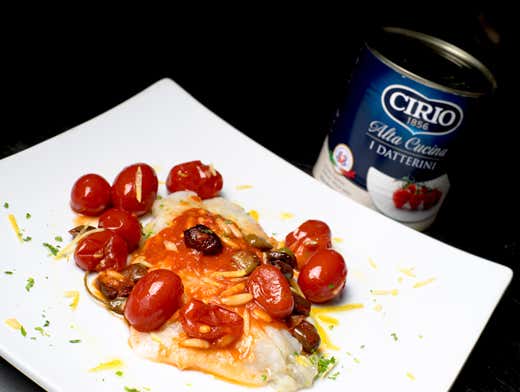 Ricetta di Fabrizio Barontini, coordinatore chef Uir (Unione italiana ristoratori)Ingredienti (per 4 persone): 4 filetti di San Pietro intorno ai 150 g l’uno, 400 g pomodoro Datterini Cirio Alta Cucina, 100 g olive denocciolate, 50 g pinoli, 50 g capperi, 1 limone, farina, olio extravergine, sale, pepe.