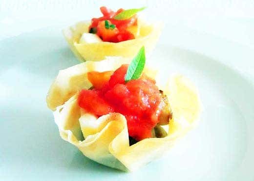 Preparazione: Spennellare di burro fuso, delicatamente, i fogli di pasta fillo, dove effettueremo dei tagli a mò di sfera con un coppa pasta. Sistemare il primo cerchio sul fondo di una cocotte leggermente imburrata. Ripetere la stessa operazione con un'altra sfera di pasta adagiandola sui lati della cocotte. Usare un altro pezzo di pasta finchè non copriremo tutti i lati della cocotte. Cuocere i cestini in forno già caldo a 180 gradi per 10 minuti, forno statico. Lasciar leggermente raffreddare i cestini che verranno a forma di rosa dopo averli estratti dalle cocottine. Con un coltellino incidere i pomodori che terremo qualche minuto in acqua ghiacciata, eliminare la pelle, e i semi, estrarre l'acqua facendo delicatamente pressione, ricavare dei dadini dalla polpa più esterna e dura.