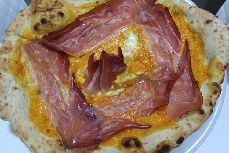 Procedimento: mettere nell'impastatrice l'acqua, il sale e il lievito, far sciogliere e aggiungere la farina. Impastare per 20 minuti, poi procedere allo staglio dei panetti e lasciare a riposo per 16-18 ore. Stendere il disco di pasta dando la forma circolare di circa 33 cm e aggiungere sul fondo la crema di panna e peperoni precedentemente preparata col mixer, aggiungere la scamorza e l'olio extravergine d'oliva. Infornare per un minuto scarso e all'uscita dal forno guarnire con le fette di speck tirolese.