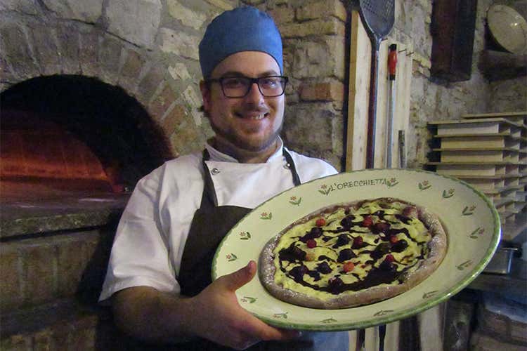 Ricetta di Walter Pizzulo del Ristorante L'Orecchietta, Candela (Fg), presentata al concorso Vide’O Pizza quant’è Bella 2016 nella categoria “pizza dessert”.Ingredienti: crema di ricotta, gelsi, cioccolato gianduia, zucchero a velo.