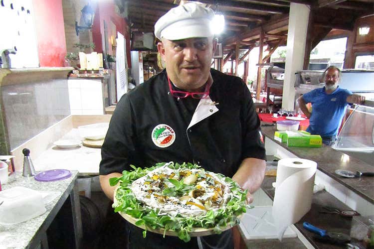 Ricetta di Abramo Fini del Ristorante Nashville, Roma, presentata al concorso Vide’O Pizza quant’è Bella 2016 nella categoria “pizza dessert”.Ingredienti: crema, canditi, pere, perline di cioccolato fondente, menta, zucchero a velo.