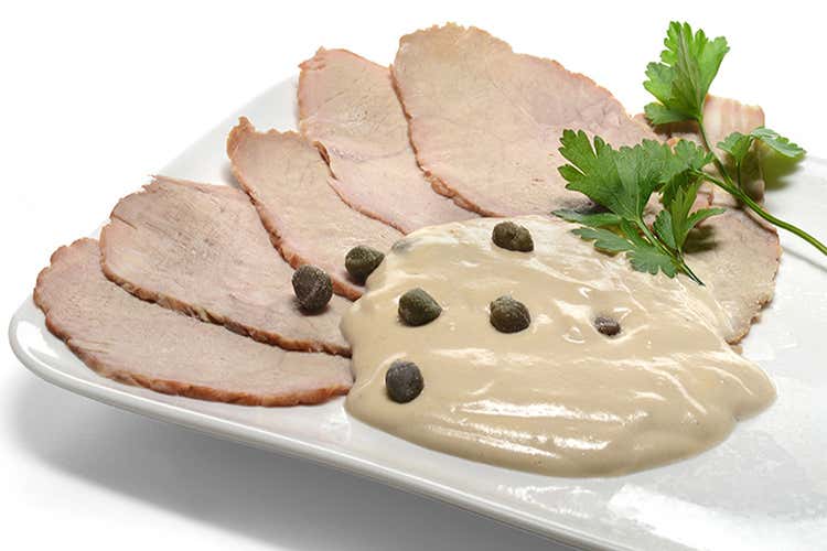 Preparazione: in una pentola mettere la carota, il porro e il sedano puliti, una manciata di sale grosso, l’olio e l’aceto e aggiungere acqua in modo poi da potervi bollire la carne. Portare a bollore e solo allora aggiungere la carne. Riportare a bollore, coprire parzialmente con un coperchio e abbassare la fiamma. Proseguire la cottura fino a quando la carne non è tenera (circa 2 ore). Farla raffreddare completamente nel liquido di cottura. Quando la carne è fredda, tagliarla a fette molto sottili, disporle sul piatto di portata e coprirle con la Salsa al tonno Senna. Guarnire con qualche cappero e far trascorrere qualche ora prima di servire in modo da far insaporire bene la carne.
