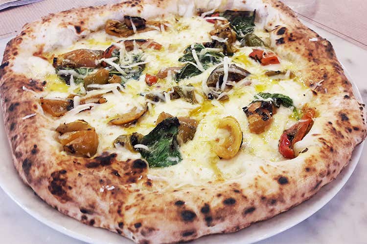 Pizza bianca con fior di latte, papaccella napoletana sottolio grigliata, Conciato romano e olio extravergine di oliva. Abbinamento consigliato : Dom Pérignon Rosé.