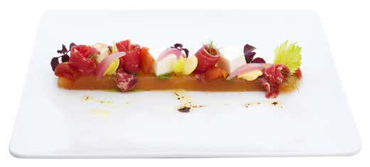 Ingredienti (per 4 persone): 280 g filetto di manzo irlandese, 160 g Cuor di Pelato Cirio Alta Cucina, 80 g feta greca, 80 g pesto alla genovese, 40 g demi-glace, 40 g cipolla rossa di Tropea, 12 g sedano, 8 g agar agar, 4 g sale fino, 80 cl olio extravergine, 6 cl aceto balsamico, 16 lupini, erbe aromatiche
