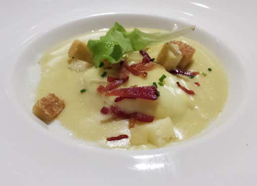 Uovo affogato in crema di patate, Puzzone di Moena e speck croccante