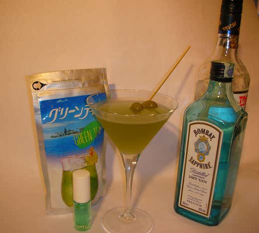 Descrizione : fresco ed armonioso. Ingredienti : 2,25 cl di Green Tea; 5,25 cl di London dry Gin; dash di sciroppo di zucchero di canna; un'oliva verde; spray di Assenzio. Preparazione : nello shaker Boston. Servizio : coppa a Martini ghiacciata.