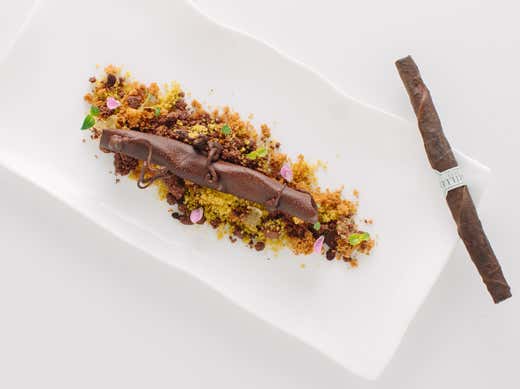 Mise en place: adagiare il sigaro di cioccolato su un piatto piano lungo insieme ai cake e gli streusel. Guarnire con fave di cacao, gruè di pistacchi, crème de Cassis, sfoglia di cioccolato con polvere d’oro zecchino, germogli di prezzemolo, sakura rosso, petali di fiori eduli. Abbinare a long filler kentucky.