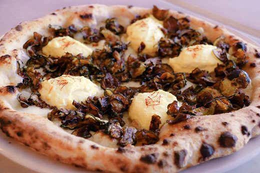 Nel frattempo friggere le zucchine a 180°. Ammaccare la pizza e condire con 150 g di ricotta precedentemente emulsionata con lo zafferano e 20 g di pecorino. Infornare in un forno a legna a 485° per un minuto e farcire con le zucchine fritte e un pizzico di pepe macinato.