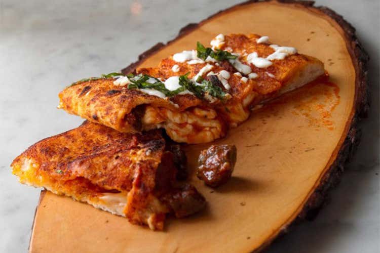 Procedimento: impastare gli ingredienti per 14 minuti, far lievitare la massa ottenuta per 6 ore a temperatura ambiente, nel frattempo preparare gli ingredienti e il forno. Stendere il panetto lievitato e farcire nel centro con il fiordilatte e il soffritto. Richiudere a mo' di mezzaluna e aggiungere il pomodoro pelato, qualche foglia di basilico e qualche tocchetto di fiordilatte. In forno per 4 minuti.