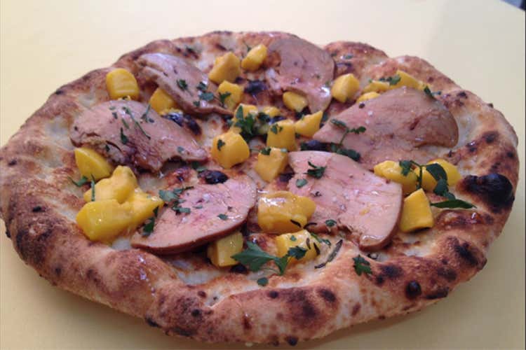Focaccia cotta in forno a legna farcita, una volta cotta, con mango fresco e foie gras affumicato, accompagnata da miele d'acacia e prezzemolo italiano.