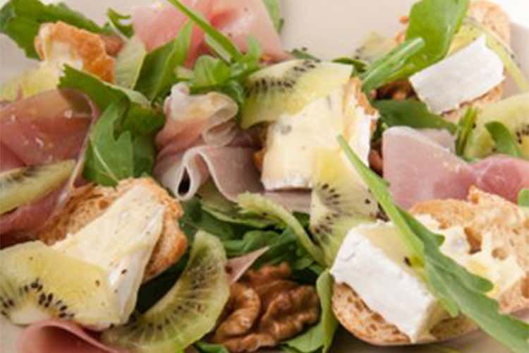Ingredienti: 4 kiwi Zespri Green (mondati e tagliati); 200 g di rucola ben lavata, 12 fette di Prosciutto di Parma tagliate in tre, una manciata di noci sgusciate, 150 g di gorgonzola; 12 crostini piccoli; 4 cucchiai di olio di oliva; 2 cucchiai di aceto balsamico; pepe nero q.b.; fior di sale q.b.