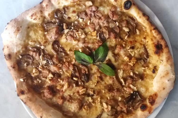 Procedimento: mettere nell'impastatrice l'acqua, il sale, il lievito e amalgamare. Aggiungere man mano la farina fino a raggiungere la giusta consistenza. Impastare 15 minuti. Lasciare riposare 20 minuti. Poi procedere allo staglio dei panetti da circa 300 g ciascuno e lasciar riposare. Stendere il disco di pasta e mettere sul fondo la salsa ai funghi poi la salsiccia sbriciolata, precedentemente saltata in padella, mozzarella e provola. Cuocere circa 90 secondi e all'uscita aggiungere le noci sbriciolate grossolanamente e qualche foglia di basilico. Un giro d'olio ed è pronta!