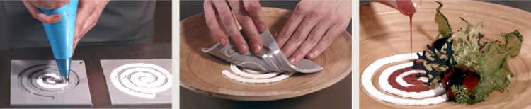 Procedimento: frullare bene la seppia tagliata a pezzi. Aggiungere l’albume, il colorante, sale e pepe. Continuare a frullare bene. Passare a setaccio fine. Passare sottovuoto per eliminare l’aria. Stendere l’impasto ottenuto in stampi a spirale Gourmand Pavoni Italia. coprire con un pezzo di pellicola. Cuocere in forno a vapore 65°C per 8-10 minuti. Sformare direttamente nel piatto e completare.