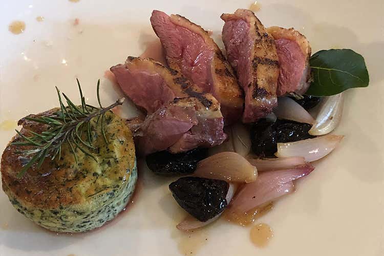 Ingredienti (per 2 persone): 400 g petto d’anatra, 200 g scalogno, 200 g prugne essiccate, zucchero, aceto rosso, sale, pepe e aromi. Per il flan di cicoria: un mazzo di cicoria già sbollentato, 50 g ricotta, 3 uova