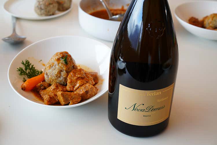 Il gulasch di vitello con canederli ai funghi porcini, servito con un Nova Domus Riserva 2018 di Cantina Terlano