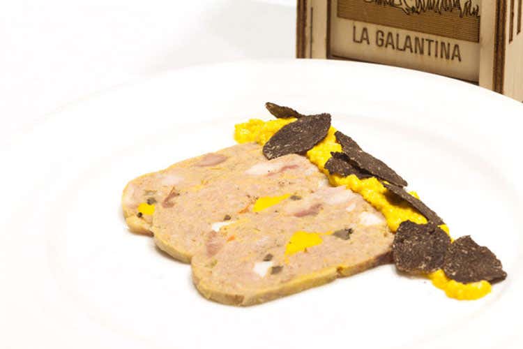 Preparazione: Disossare la gallina, farcirla con tutto il ripieno ben amalgamato, cucirla con un filo di cotone, arrotolarla con una carta forno, stringerla con uno spago e metterla a bollire in 3 lt d’acqua con una carota una cipolla, un gambo di sedano, e lo scheletro della gallina. Bollire per 180 minuti, scolare e disporre la galantina su un asse di legno o di marmo con sopra un peso di 3/4 kg e lasciare raffreddare. Togliere la carta e tagliare a fettine. Nel brodo caldo colare i tuorli con il parmigiano e tutti gli ingredienti della salsa e mantecare. Disporre le fettine sopra la salsa calda e affettare il tartufo.