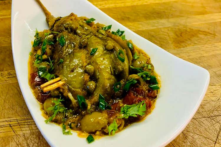 Ingredienti: 300 g di melanzane intere, ¼ di cucchiaino di sale, ¼ di tazza di olio d'oliva, ¼ di tazza di sedano tritato, ¼ di tazza di cipolla tritata, 2 cucchiaini di aglio tritato, ¼ cucchiaino di polvere di curcuma, 2 cucchiaini di pasta di tamarindo, sale q.b., 1 cucchiaio di zucchero di canna, ¼ di tazza di pomodoro secco, 10 olive verdi ripiene, 1 cucchiaio di capperi, 2 cucchiai di succo d'uva, 1 cucchiaino di succo di limone, 1 cucchiaino di mix italiano, 1 cucchiaio di pinoli, ¼ di tazza di brodo vegetale, ¼ di cucchiaino di polvere di pepe nero, 2 cucchiai di coriandolo tritato, 2 cucchiai di cipollotto tritato (solo parte verde), 1 cucchiaino di olio di peperoncino.