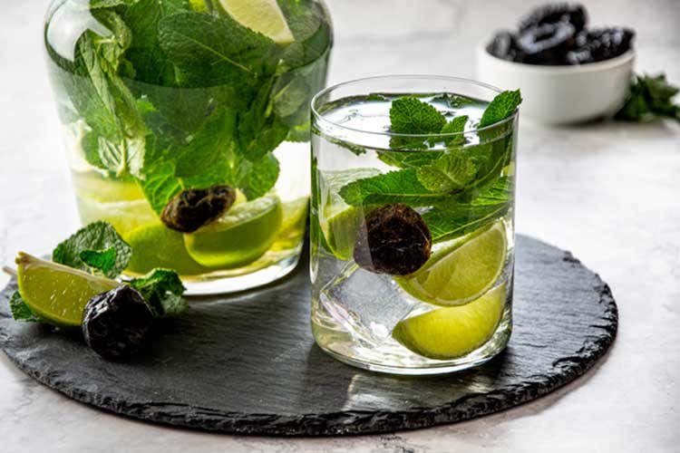 Lavare la menta e i lime. Eliminare dalla menta le parti di gambo più coriacee e spremere un lime. Tagliare l’altro lime in spicchi e unire il tutto in una brocca insieme all’acqua (Se i lime sono trattati è preferibile eliminare la buccia). Aggiungere le Prugne della California e mescolare. Per far sì che le prugne rilascino un sapore più intenso è consigliato pestarne 2-3 con un pestello prima di aggiungerle all’acqua. Riporre in frigorifero e lasciate riposare per 2 ore prima di servire.