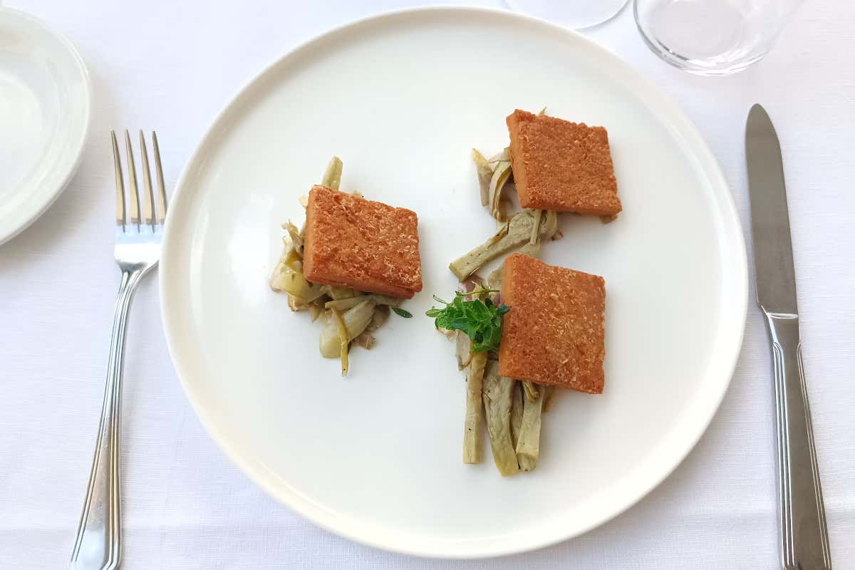 Servire i quadrati di cecina con una cucchiaiata di carciofi.
