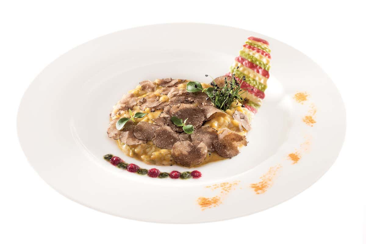 Lasciare riposare 3 minuti, quindi porre il risotto sul piatto e servirlo con lamelle di tartufo molto fini.