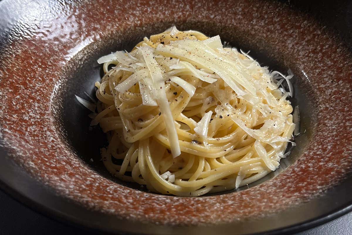 Quando la pasta risulta cremosa, potatela nel piatto prescelto e guarnite con del pepe nero macinato a mortaio e una julienne di Pecorino.