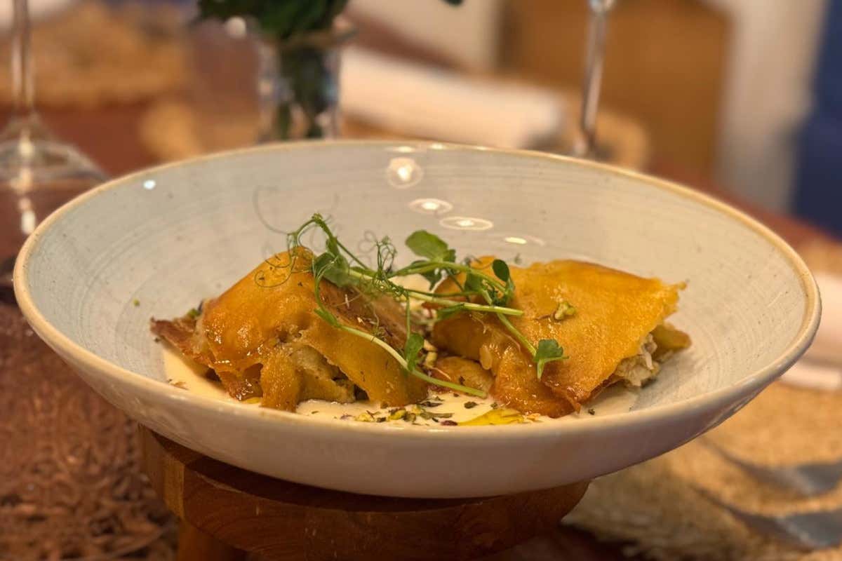 La panillara di panelle con ragù di maialino nero dei Nebrodi, besciamella al pistacchio e mozzarella unisce la tradizione siciliana delle panelle con ingredienti di alta qualità e sapori decisi. Il ragù di maialino nero dei Nebrodi, ricco e aromatico, incontra la besciamella al pistacchio, la mozzarella fior di latte e la granella di pistacchio, il tutto racchiuso tra strati di panelle croccanti. La fonduta di formaggi alla base completa il piatto, regalando un contrasto cremoso e avvolgente ad ogni boccone.