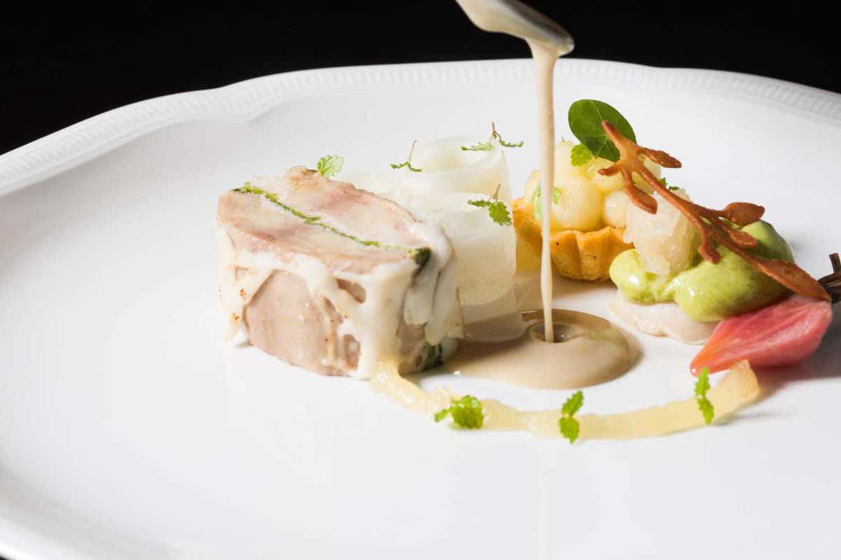 Si tratta di una preparazione che fonde pesce d’acqua dolce e sentori marini. Si inizia con la crepinette di pesce siluro, farcita con mousseline e lattuga di mare, avvolta in rete di maiale e cotta a bassa temperatura. Il piatto si arricchisce con una bagna cauda alle alghe, dove acciuga, colatura di alici e polveri marine esaltano il fondo iodato. A contrasto, una scapece di daikon, gel e sfere di mela Annurca, e una tartelletta salata accolgono il frutto in diverse consistenze. Una cialda croccante al Grana Padano e germogli completano la composizione.