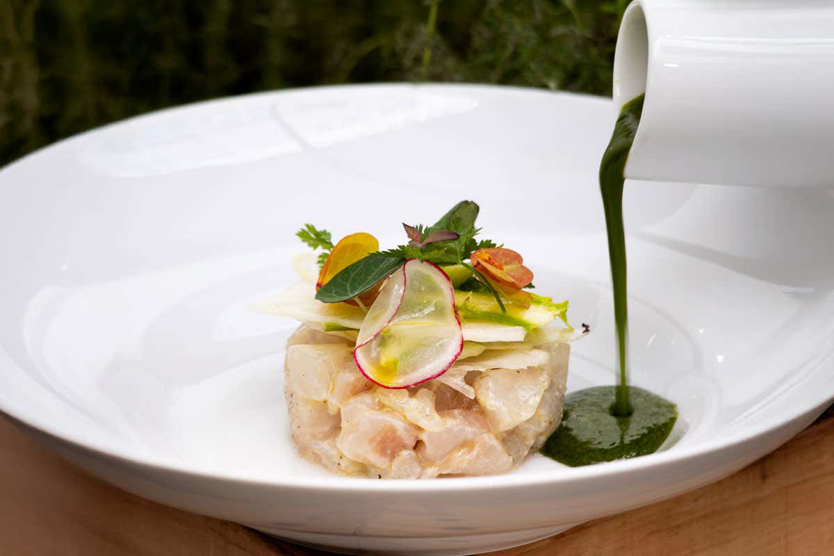 Un ceviche esotico che fonde la freschezza del branzino con i profumi speziati dell’Asia. Il leche de tigre classico incontra una variante verde agli spinaci, dando vita a un piatto elegante, intenso e sorprendente, perfetto per l’estate.