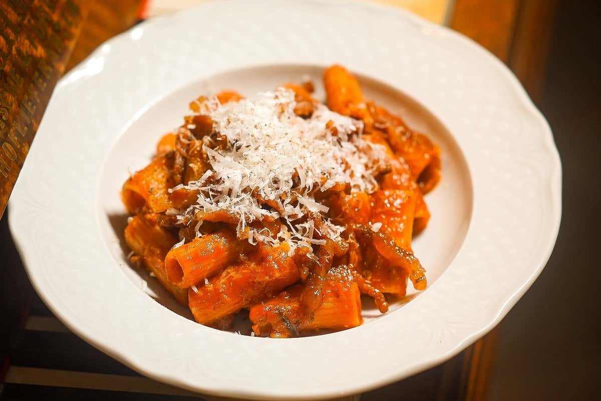 L’Amatriciana dello chef Andrea Lattanzi della Taverna Flavia di Roma è un classico della tradizione romana: rigatoni conditi con una salsa lenta a base di guanciale dorato, pomodori pelati, pepe e pecorino romano, con il guanciale croccante come tocco finale. Il piatto valorizza la cottura lenta della salsa e l’equilibrio tra il sapore deciso del guanciale e la cremosità del pecorino.
