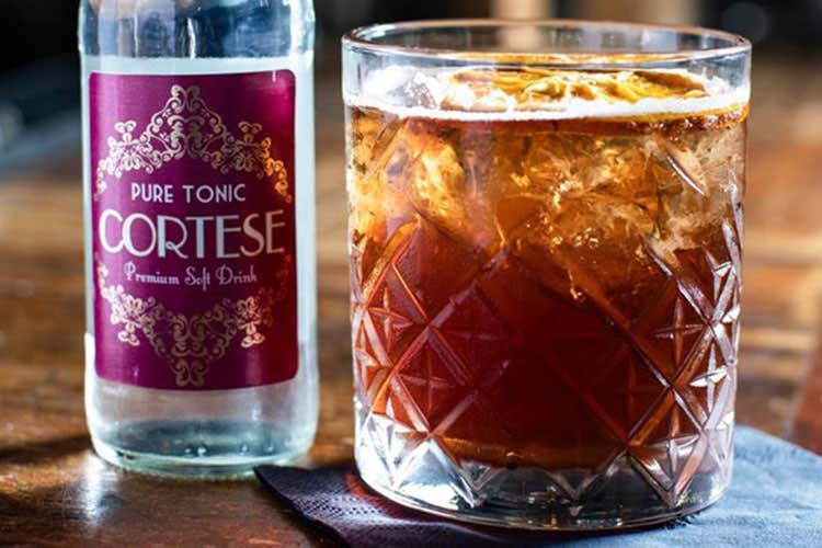 build. Versare tutti gli ingredienti, tranne la Cortese Pure Tonic, in un tumbler basso precedentemente raffreddato. Aggiungere ghiaccio fino a colmare il bicchiere e completare con un top di Cortese Pure Tonic. Decorare con una fetta di arancia essiccata e tre chicchi di caffè tostati al momento con il cannello.