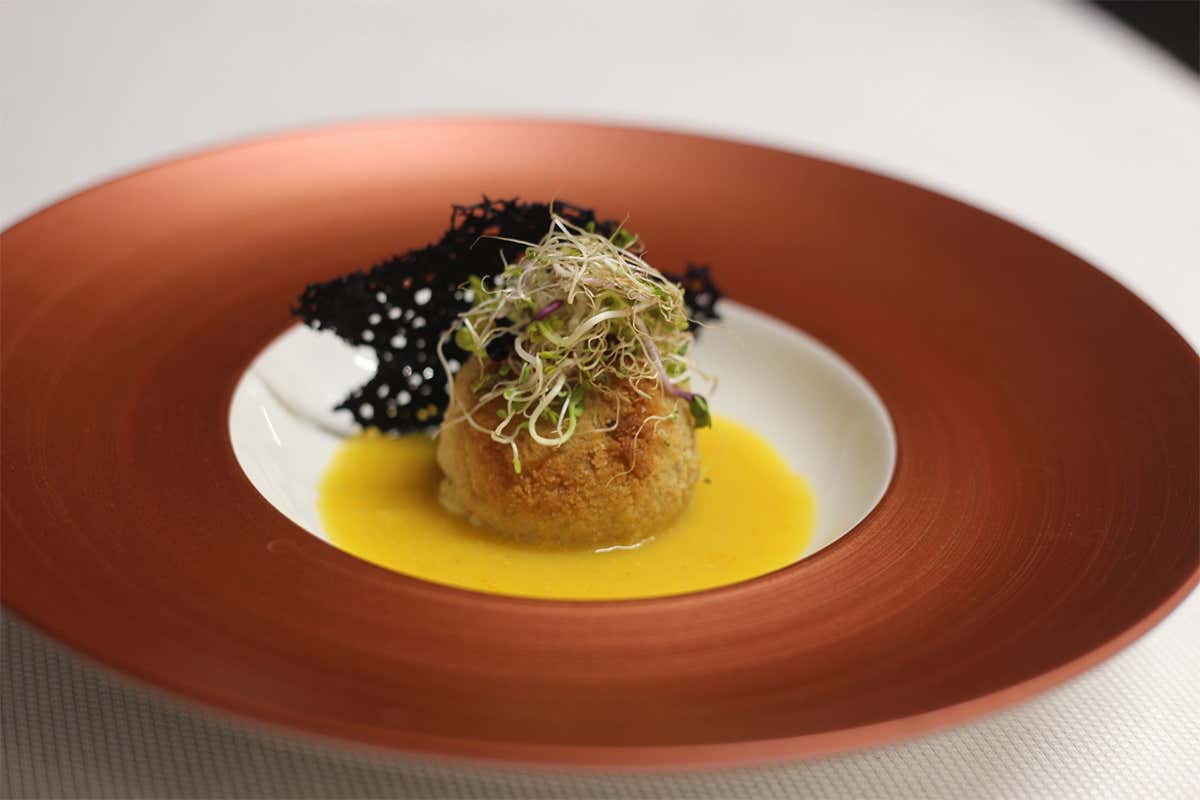 L'arancino con ricci di mare e stracciatella di Campotenese è un piatto che unisce tradizione e innovazione, offrendo un'esperienza gustativa unica. La combinazione di sapori marini, la cremosità della stracciatella e la croccantezza della frittura rendono questo arancino perfetto per stupire i tuoi ospiti in occasioni speciali. La presentazione elegante, accompagnata dalla salsa di pomodoro giallo e guarnita con germogli di porro, eleva questo piatto a una vera delizia gourmet, capace di sorprendere e deliziare i palati più esigenti.